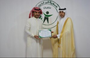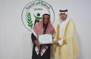 رئيس مركز إمارة ذهبان الأستاذ معيض بن سيف العتيبي يكرم (المهندس فيصل زكي الجدعاني من موظفي جمعية البر الخيرية بذهبان )